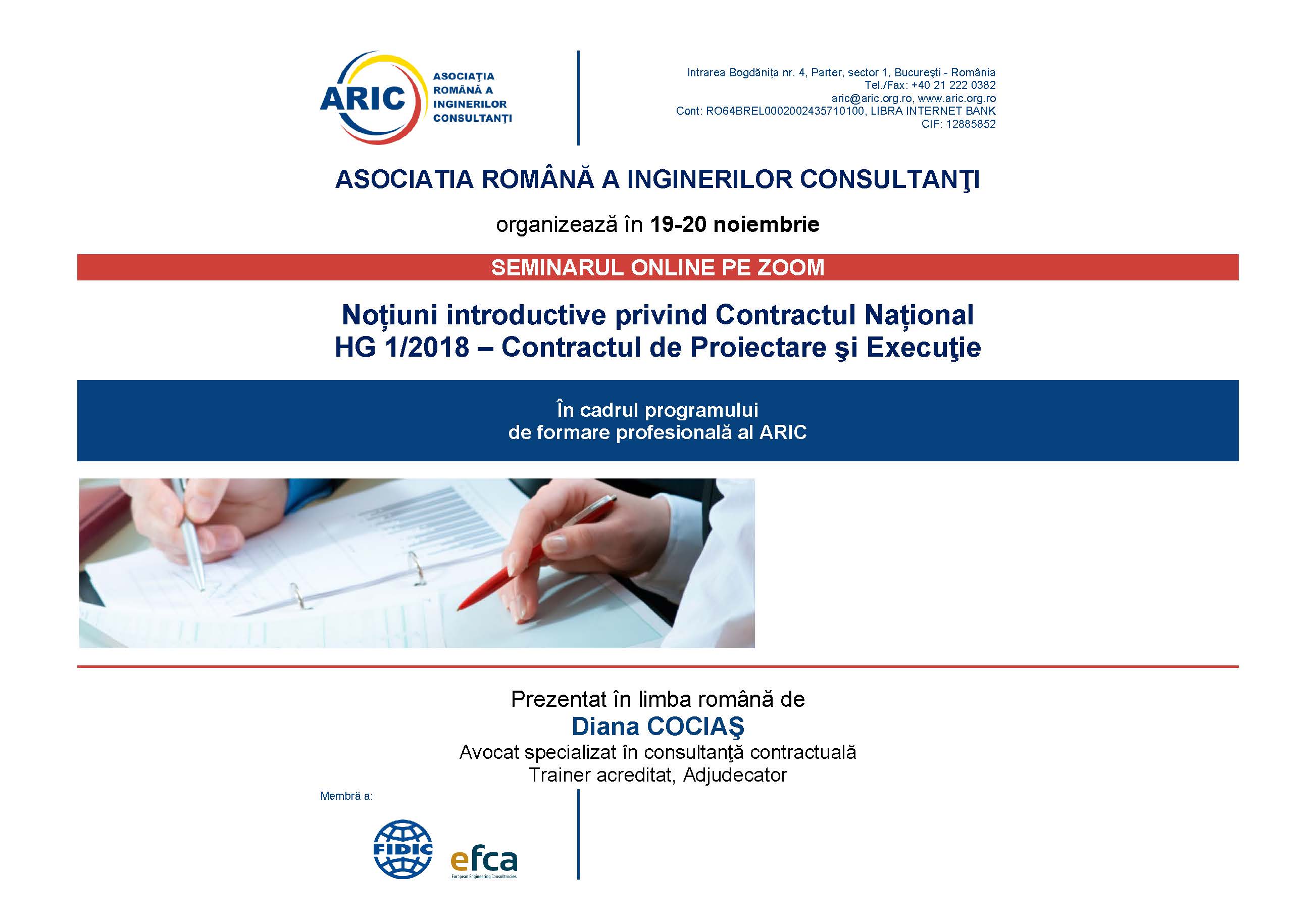 PARTICIPAREA ARIC LA CONFERINȚA GLOBALĂ DE INFRASTRUCTURĂ FIDIC 2025 Vicepreședinții ARIC, Diana Cocias și Cosmin Tobolcea, au reprezentat asociația la cel mai înalt nivel în cadrul FIDIC Global Infrastructure Conference 2025[...] BAROMETRUL EFCA PRIMAVARA 2025 Barometrul EFCA Primavara 2025 a fost publicat.În ciuda unui peisaj economic în schimbare, sectorul european de consultanță în inginerie [...] DECLARATIA DE LA LUXEMBURG PRIVIND ACHIZITIILE PUBLICE Adoptată imediat după încheierea conferinței EFCA 2025 de saptamana trecuta, „Arhitecți + Ingineri: Parteneriat pentru Proiectarea Rezilienta” [...] CONFERINTA EFCA 2025 In perioada 15-16 mai a avut loc la Luxemburg Conferinta anuala a EFCA 2025. Anul acesta, conferinta a fost organizata in parteneriat cu asocaciatia Inginerilor si Arhitectilor din Luxemburg [...] PROTOCOL DE COLABORARE ARIC – CNIR - COMPANIA NATIONALA DE INVESTII RUTIERE ARIC si Compania Națională de Investiții Rutiere au semnat in februarie un protocol de colaborare în vederea realizării unei documentații de atribuire [...] | |